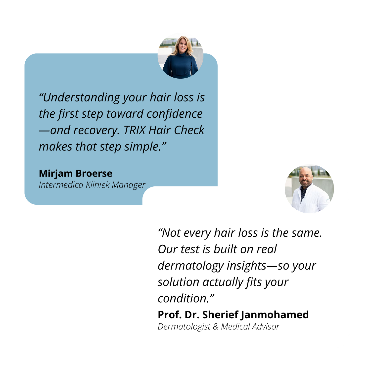 Nee, de TRIX Haarcheck is geen officiële diagnose. Het is een hulpmiddel gebaseerd op dermatologische expertise dat helpt om het type haaruitval te herkennen en een passende supplementaanbeveling te doen. Voor een medische diagnose adviseren wij een consult bij een specialist.